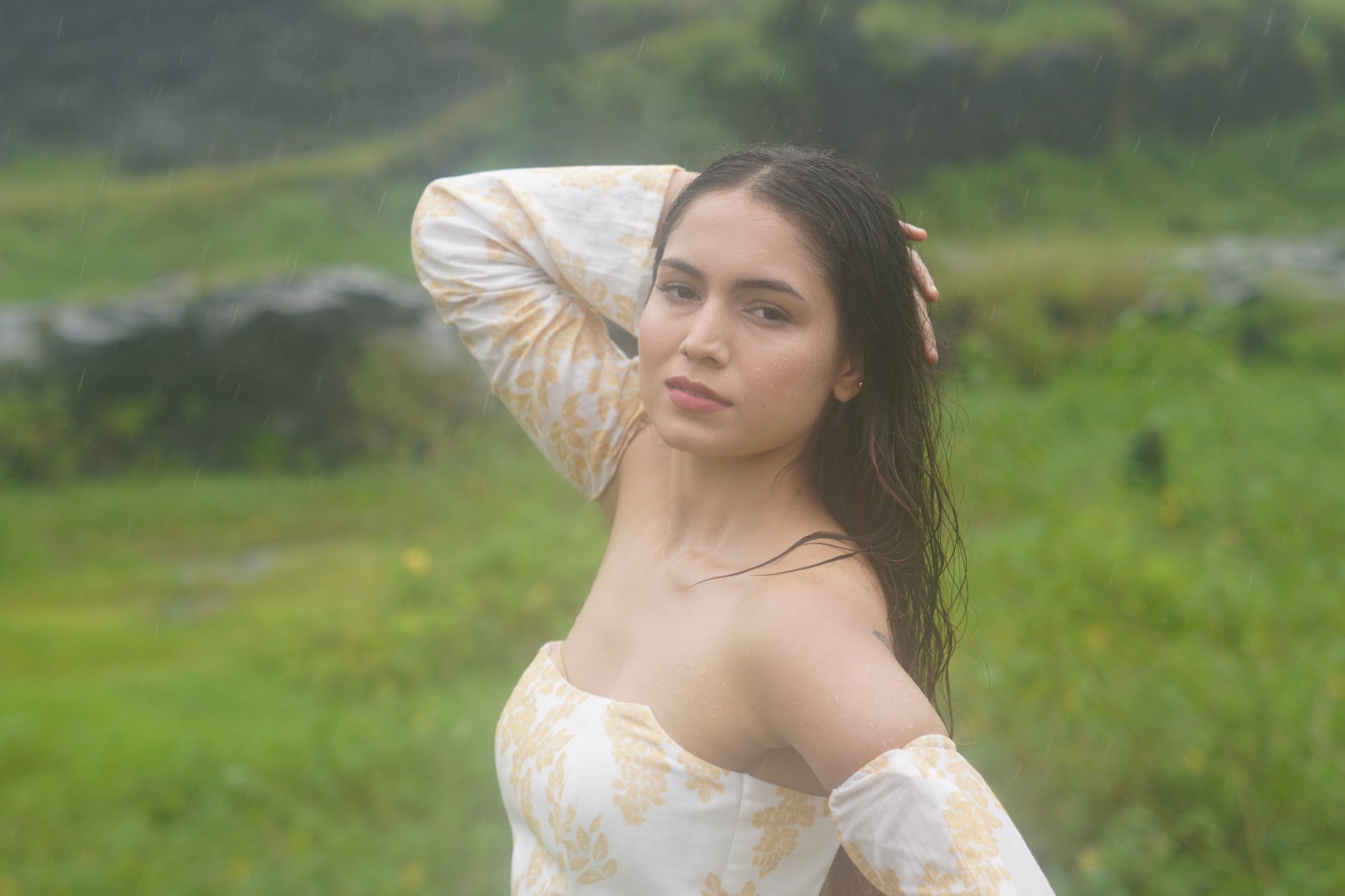 A bold corset with detachable sleeves, elasticated at the top for a secure fit. Designed in cotton-linen with a vibrant yellow reactive digital print, and finished with a fully openable back zipper.